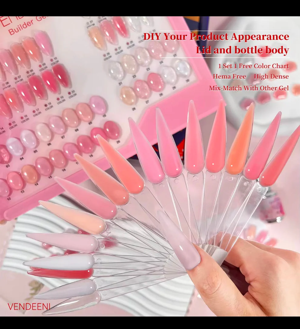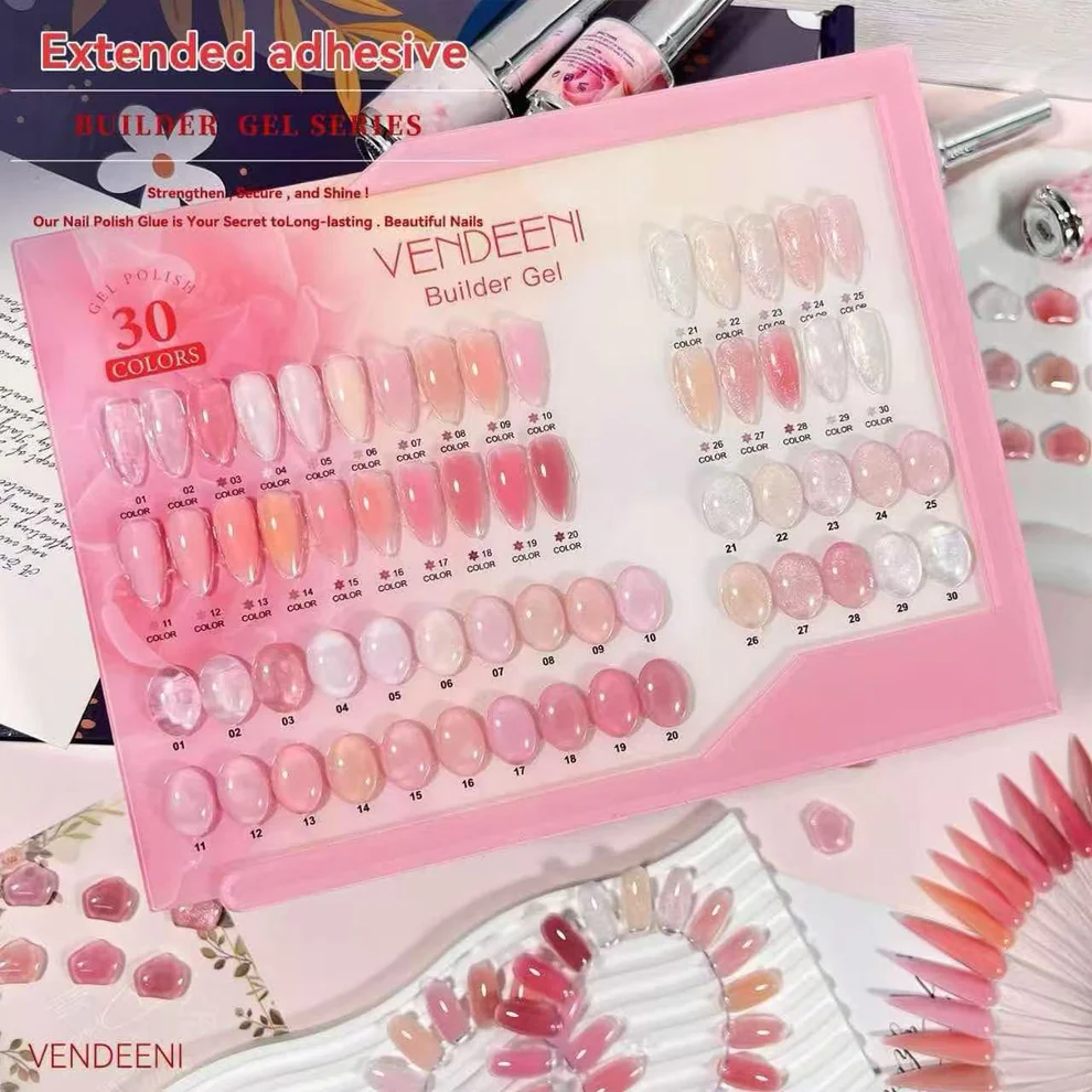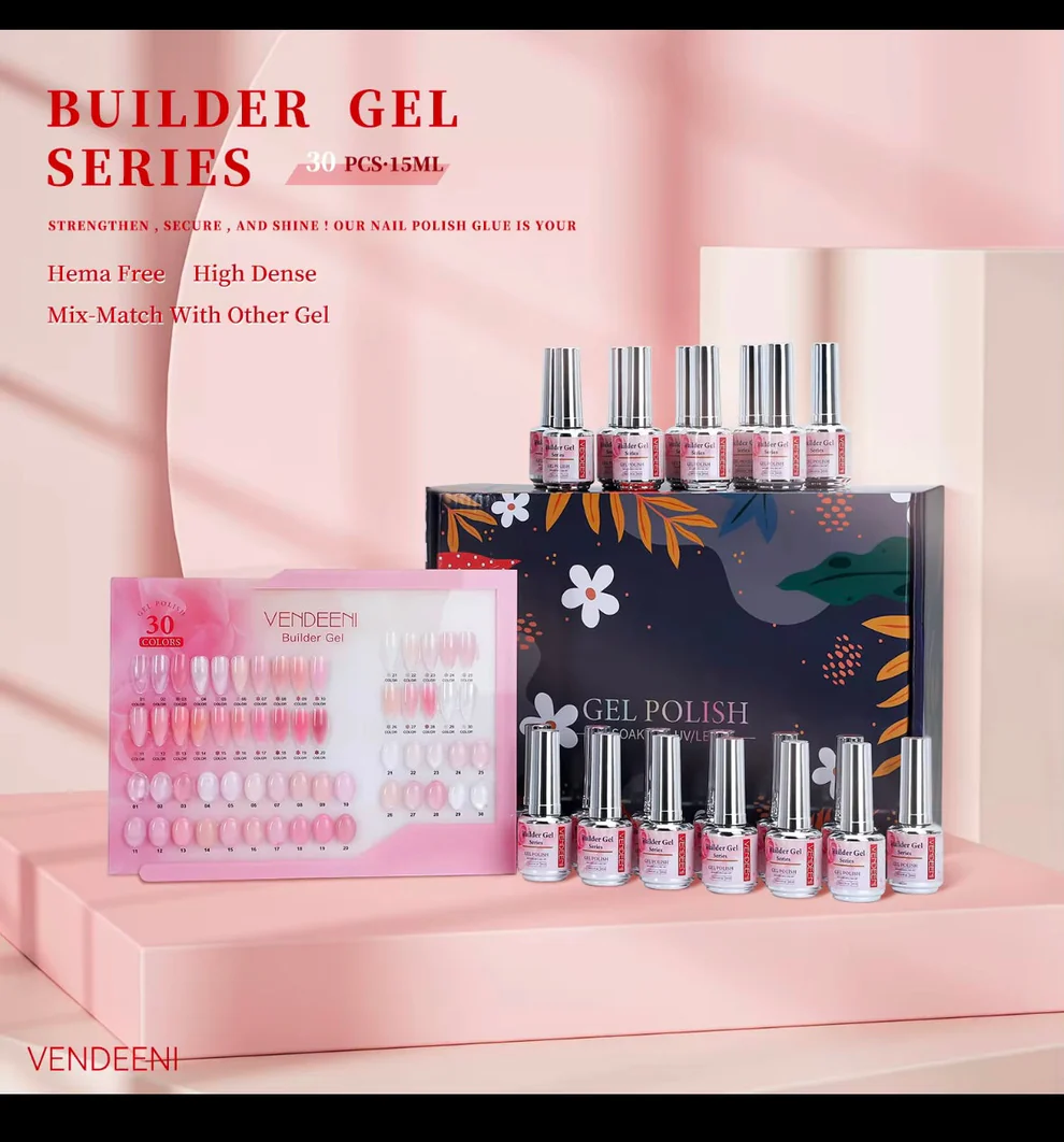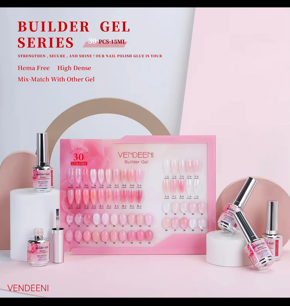 The Vendeeni Builder Gel features 30 versatile shades, including clear, nude, pink, and natural tones. Perfect for strengthening and sculpting nails, its thick, high-density formula ensures durability and a natural finish. Ideal for BIAB manicures, it promotes healthy nail growth while minimizing breakage. Comes with a free color chart and box.