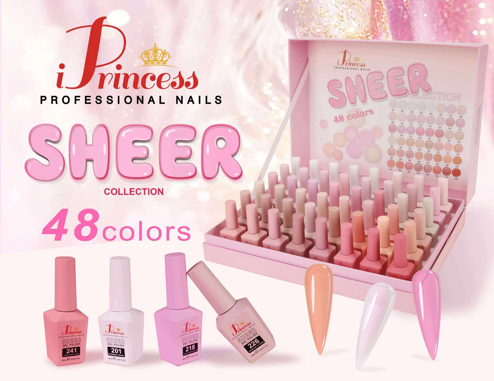 iPrincess Sheer Collection a professional Gel Polish Kit with 48 gel only sheer shades. Each color can be layered 2–3 coats to adjust opacity, creating soft, natural, and elegant nail looks. Comes in 1 box with a full color display for easy selection.